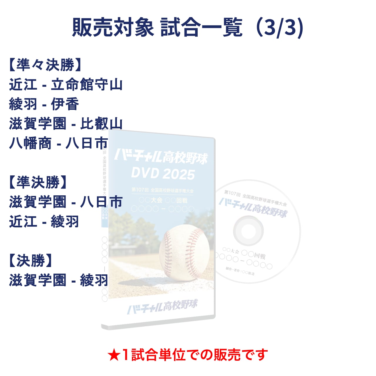 この販売ページでは、滋賀大会 1回戦/2回戦/3回戦/準々決勝/準決勝/決勝を1試合単位でご購入いただけます。